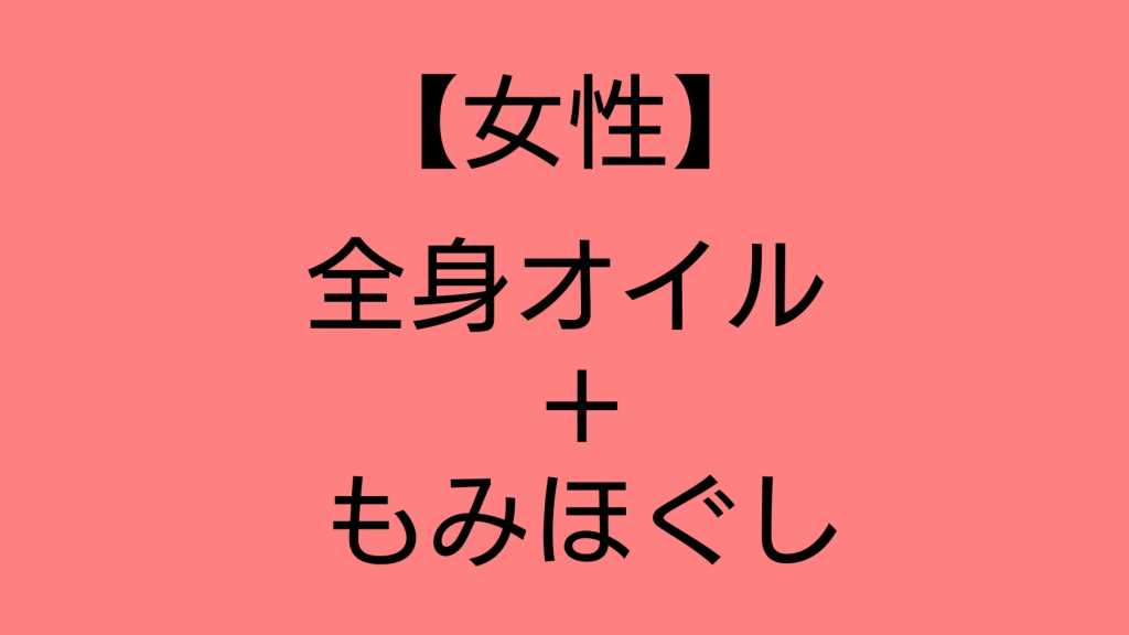 【女性限定のコース】です。 オイルで老廃物を流しやすくする 「深い圧の整体オイル施術」です。 流し+ほぐしで、深部までアプローチします。 【施術内容】 ・背中オイル+全身ほぐし ・脚オイル+全身ほぐし ・全身オイル+背面ほぐし