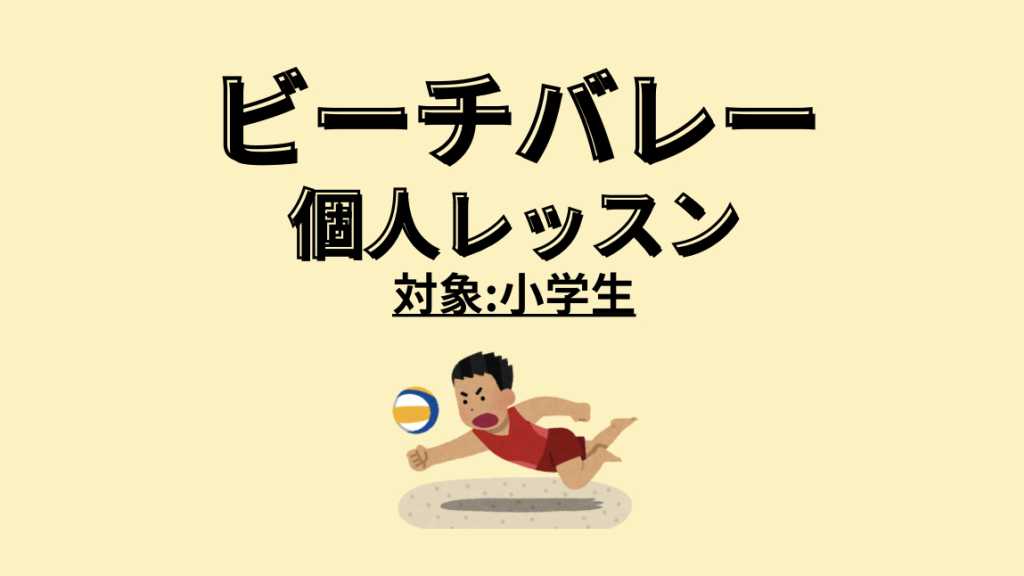 ビーチバレー個人レッスンで、夢を叶えよう!🏐✨ Hiroコーチが、あなたに合わせたマンツーマンレッスン! ビーチバレーの楽しさを、もっと深く知りたいあなたへ! あなたのレベルに合わせた丁寧な指導を行います! 個人レッスンだから、周りの目を気にせず、自分のペースで、じっくりと練習できます! 目標に合わせたカリキュラムで、確実にスキルアップ! 個人レッスンのメリット ・自分のペースで練習できる ・レベルに合わせた指導を受けられる ・コーチに質問しやすい ・短時間で効果的に練習できる ・目標達成へのモチベーションアップ 【参加費】 小学生/3,500円/45分 (年会費会員 1回3,000円) 対象: ビーチバレー初心者の方、経験者の方 ペアの場合: 15分追加 【当日の流れ】 開場 開始時間20分前より可能。 受付 開始時間の15分前。 受付後、各自ストレッチを!