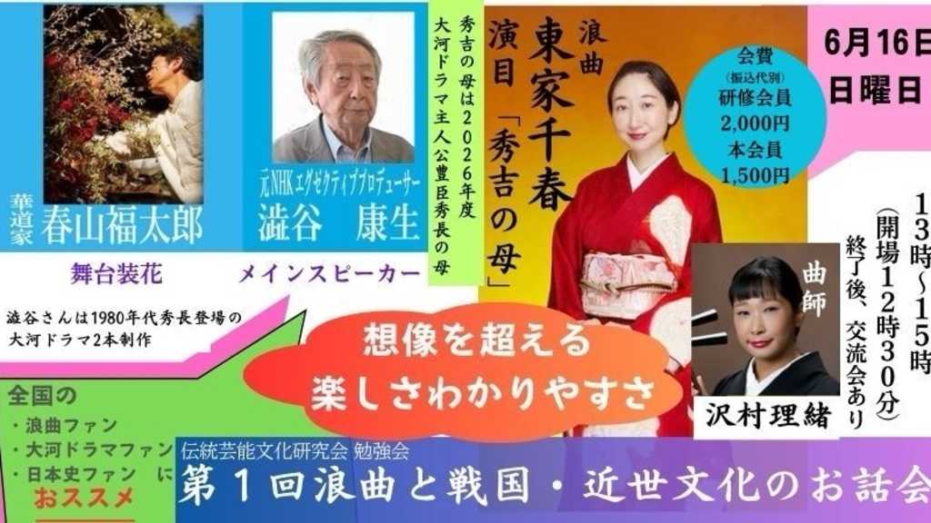 「秀吉の母」は2026年度大河ドラマの主人公・豊臣秀長の母。浪曲ファン、大河ドラマファン、日本史ファン、戦国時代ファンにおススメ 第1回浪曲と戦国・近世文化のお話会 伝統芸能文化研究会 浪曲 東家千春 メインスピーカー 元NHK大河ドラマプロデューサー澁谷康生(事務局 いずみ書房) 「秀吉の母」は2026年度大河ドラマ『豊臣兄弟』の主人公・豊臣秀長の母。 大河ドラマファン、日本史ファン、江戸文化ファン、浪曲ファン 浪曲初心者向けのお話会です。浪曲の演目は「秀吉の母」。 浪曲終了後、 豊臣秀吉と秀長兄弟の母・大政所なかが登場する 『おんな太閤記』(1981年度NHK大河ドラマ、なか役は赤木春恵さん) 『徳川家康』(1983年度NHK大河ドラマ、なか役は鈴木光枝さん)を制作した 元NHK大河ドラマプロデューサー澁谷康生さんをメインスピーカーとして、 東家千春さん、曲師の沢村理緒さんと浪曲の演目『秀吉の母」のテーマと時代背景を中心に、 戦国乱世から天下統一に向かう日本近世の文化について親子の会話のように語りあいます。 これまで参加されたみなさんからは、 「とても面白かった」 「わかりやすかった」 「楽しかった」 「浪曲ってミュージカルみたい」 「浪曲が好きになった」 という声が寄せられています。 そして前々回は大河ドラマファンの方の質問により、 これまで語られることのなかった 初出の大河ドラマの話題を澁谷さんから語っていただける等このイベントならではの収穫もありました。 また秀長は澁谷さんの制作した大河ドラマでは、 上記の『おんな太閤記』のほか、 『春日局』に登場しました。 歴史ファン、大河ドラマファンの方の想像を超える 楽しくわかりやすいお話会になること 請け合いのイベントです。 研修会開催日時 6月16日土曜日13時から(開場12時30分) 研修会費2000円(研修会のみ参加) 本会員会費1500円(年会費をお支払いされている方) 基本的に1回でも、予約したにも関わらず、ご連絡なく来られなかった方、他のお客様からクレームのあった方は受付致しませんので。よろしくお願い致します。 ○終了後、交流会あり。会費3500円。交流会に参加していただける方は、お申し込みの際に「交流会参加」とお書きください。