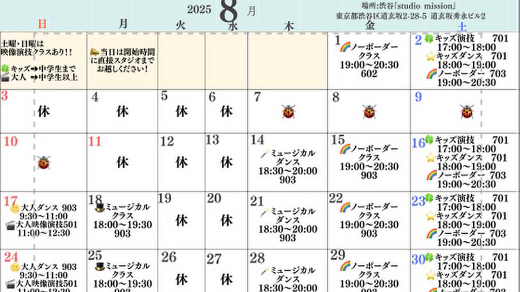 🎩【ミュージカルクラス月額料金】 週1コマ90分 ¥11,000 ※こちらは料金別途となります。 ⭐️【60分クラス月額料金】 週1コマ ¥8,800 (¥2,200) 週2コマ ¥15,200 (¥1,900) 週3コマ ¥20,400 (¥1,700) 週4コマ ¥24,000 (¥1,500) 🌈【90分クラス月額料金】 週1コマ ¥10,800(¥2,700) 週2コマ ¥17,600(¥2,200) 週3コマ ¥24,000(¥2,000) (参考:1レッスン当たりの料金) 【60•90分MIXクラス月額料金】 ①60・90 ¥16,400 ②60・60・90 ¥21,600 ③60・90・90 ¥22,800 ▽追加1レッスン毎の料金 ⭐️60分 ¥2,500 🌈90分 ¥3,000 ※月謝制の方の追加レッスン料金となります。。 ▽週4コマ以上の方はこちら 【1ヶ月受け放題月額料金】 ¥24,500 (1日最大2コマとさせて頂きます) ※各クラス定員制を設けておりますので基本的に継続して通える範囲でクラスをお選び下さい。 学校、お仕事等でご都合の悪くなられた場合は当月から翌月内で別のレッスンに振替可と致します。 【1回ビジター料金】 ⭐️60分クラス ¥3,000 🌈90分クラス ¥3,500 【個人レッスン料金】 ・スキルアップ 60分 ¥8,800《¥11,000》 ・オーディション対策 60分¥9,800《¥13,000》 《》は月謝制でない方の料金。 ※全てスタジオ代込となります。