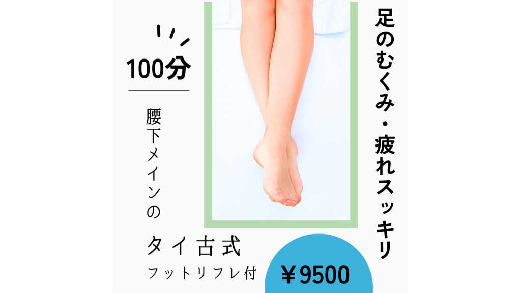 ○ コース内容 ○ 『タイ古式+フットリフレ(お膝上まで)』 ・タイ古式 面圧&点圧+ストレッチ ・フットクリームを使用(お膝少し上まで) ・足裏の反射区を刺激 ・老廃物をしっかりお流し ----------------------------------- 「足がだるーい!!」 「足が棒みたい……」 と言うみなさま! 太もも、ふくらはぎ、すね、足首、足指、足裏などなど タイ古式のバリエーション豊かな技とストレッチで 腰下のお疲れへ360度、とことんアプローチ♩ ___ご予約の方へ_________ ◯施術前後 フットバス、お着替え、施術後のお飲み物など。プラス30分ほどイメージください。 お急ぎの方は来店時、お気軽にお声かけください。 ◯待合室がございません。15分以上早く到着の場合、店外でお待ち頂く可能性があります。 ◯キャンセル、15分以上遅れる場合は、公式LINEへご連絡ください。【公式LINE:@643psdme】
