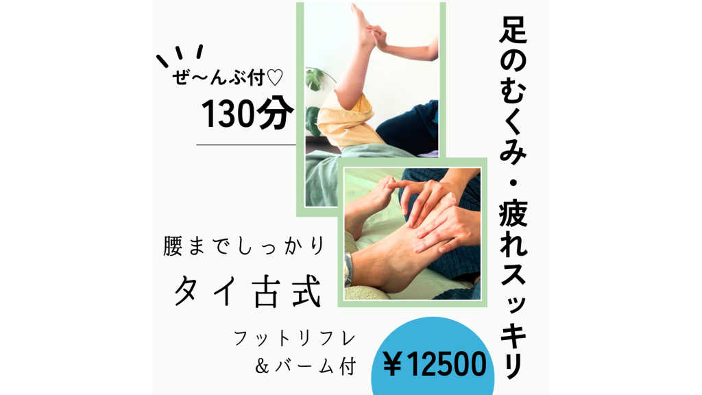 ○ コース内容 ○ 『タイ古式+ハーバルバーム+フットリフレ』 ⭐︎タイ古式 ・面圧&点圧 ・ストレッチ ⭐︎爽快感のあるバーム(軟膏)をポイント使用 ・筋肉の凝りをゆるめ ・可動域を広げ ・血流&リンパの流れを手助け ⭐︎フットクリームを使用(お膝の少し上まで) ・足裏の反射区を刺激 ・老廃物をしっかりお流し ・血流&リンパの流れを手助け ---------------------------- 足の浮腫み、だるーい腰 ハリハリの太ももやお尻 とにかく腰から下がお辛い方! お尻、腰、太もも、ふくらはぎ、すね 足首、足指、足裏などなど バリエーション豊かなタイ古式の圧とストレッチで 腰までのお疲れにとことんアプローチします♩ ___ご予約の方へ_________ ◯施術前後 フットバス、お着替え、施術後のお飲み物など。プラス30分ほどイメージください。 お急ぎの方は来店時、お気軽にお声かけください。 ◯待合室がございません。15分以上早く到着の場合、店外でお待ち頂く可能性があります。 ◯キャンセル、15分以上遅れる場合は、公式LINEへご連絡ください。【公式LINE:@643psdme】