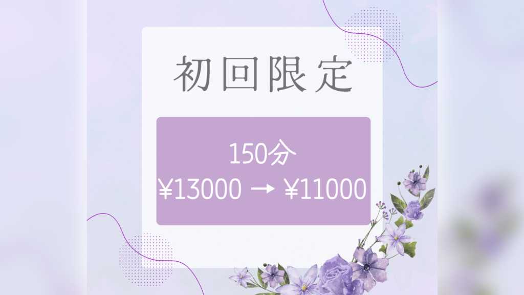 当サロンがはじめての方限定! 2000円引で、13000円→11000円 普段はノータッチなパーツへも、丁寧にアプローチできる長さです。 「150分も何するんだろう?」 と不思議に思ったり、びっくりされるかもしれませんが「逆にふれない箇所は? 」 と思うのがタイ古式! じっくりケアしていきます♪ ___ご予約の方へ_________ ◯施術前後 フットバス、お着替え、施術後のお飲み物など。プラス30分ほどイメージください。 お急ぎの方は来店時、お気軽にお声かけください。 ◯待合室がございません。15分以上早く到着の場合、店外でお待ち頂く可能性があります。 ◯キャンセル、15分以上遅れる場合は、公式LINEへご連絡ください。【公式LINE:@643psdme】