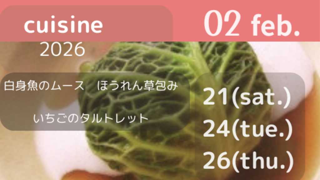 2月cuisine 白身魚のムース ほうれん草包み いちごのタルトレット 白身魚をムース仕立てにした蒸し料理です。フレンチの基本に沿って春を感じるような彩りの良いひと品を作ります。 旬のいちごのデザートで締めくくります。 2月21日(土) 24日(火) 26日(木) ☆★お支払いの詳細、キャンセルポリシーに関しては、 トップページに記載されていますので、ご覧ください。 問い合わせ info@estpanis.com