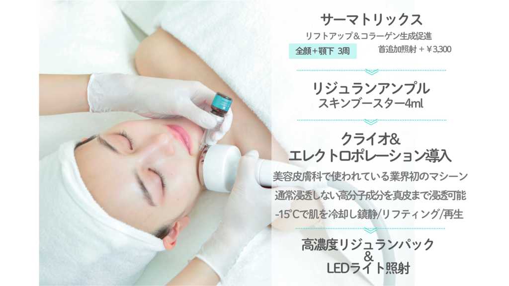 有効成分であるポリデオキシヌクレオチド(C-PDRN) に4種のアミノ酸(グリシン、ブロリン、ロイシン、リジン)と非架橋ヒアルロン酸が配合されたECM製剤です ダメージを受けた皮膚の生物学的状態を改善することで、「若いころの皮膚を取り戻す ★ポリデオキシヌクレオチド(C-PDRN)について サーモンのDNAより抽出された分子を独自の技術を用いて断片化して皮膚に高い適合性をもたせたものです。毛穴の1/670という微小サイズ化により、皮膚の深部まで浸透 老化・ストレスに対する肌バリア機能強化、肌質改善促進作用 ・目元・口元の小じわ、キメ、ハリの改善 ・お顔全体の脂分、水分のバランス回復 ・お顔全体のトーンアップ ・毛穴の縮小、角質の減少 高周波照射によりコラーゲン生成&ハリup ---------------------------- クレンジング ⬇️ サーマトリックス3周 ⬇️ リジュラン クライオセル&エレクトロポレーション導入 ⬇️ リジュランパック&LEDライト照射 ---------------------------- ※ご来店時はメイクをオフしてからご来店ください ※トレチノイン・高濃度レチノール使用中の方:1週間休薬してからご予約ください ※脱毛・顔剃り・肌を傷つける医療行為を受けたばかりの方:1週間経過後ご予約ください ※施術後のサウナ・激しい運動・飲酒はお控えください ※ダウンタイムなし ※当日メイクOK ※即日〜3日目をピークに効果を実感いただけます ●お支払い方法:現金不可・キャッシュレス決済のみ対応 ●15分以上遅れ:メニュー変更 or施術不可になる場合がございます ●キャンセル:下記の通りキャンセル料が発生致します ・当日キャンセル:3300円 ・無断キャンセル:5500円 ※尚、当日にご予約変更した場合も当日キャンセル扱いになります。