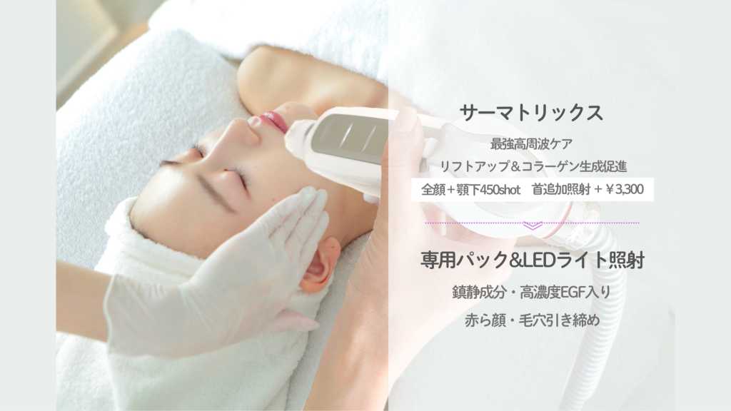 エステ版ポテンツァ×サーマクールの『サーマトリックス』で速攻リフトアップと肌質改善!ニキビ跡・クレーターにも◎ 専用EGFゲルパックを浸透させて内部炎症修復&鎮静! ---------------------------- クレンジング・洗顔 ⬇️ サーマトリックス≪全顔+顎下450shot≫ ※首照射追加+¥3,300 ⬇️ LEDライト照射&高濃度EGFパック ⬇️ 肌質に合わせたスキンケアでお仕上げ ---------------------------- ※妊娠中・授乳中の方はかかりつけの医師に確認をいただいてからご予約ください ※ご来店時はなるべくメイクをオフしてからご来店ください ※トレチノイン・高濃度レチノール使用中の方:1週間休薬してからご予約ください ※脱毛・顔剃り・肌を傷つける医療行為を受けたばかりの方:1週間経過してからご予約ください ※ 施術直後からリフトアップ◎3日後からコラーゲン生成されるためハリツヤがよりUPします ※当日メイクOK ※施術後のサウナ・激しい運動・飲酒はできるだけお控えください ●お支払い方法:現金不可・キャッシュレス決済のみ対応 ●15分以上遅れ:メニュー変更 or施術不可になる場合がございます ●キャンセル:下記の通りキャンセル料が発生致します ・当日キャンセル:3300円 ・無断キャンセル:5500円 ※尚、当日にご予約変更した場合も当日キャンセル扱いになります。 ●施術中のためお電話が繋がらない場合がございます。公式LINEにてご連絡ください@andmiyonclinical
