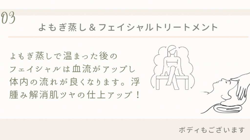 初めての方限定 よもぎ蒸し30〜40分&フェイシャル60分 よもぎ蒸しで温めたあと お顔のお手入れ、デコルテ、首や肩の疲れを取り除いていきます。 汗をかいて温まった後 むくみ解消 トーンアップを目指します!
