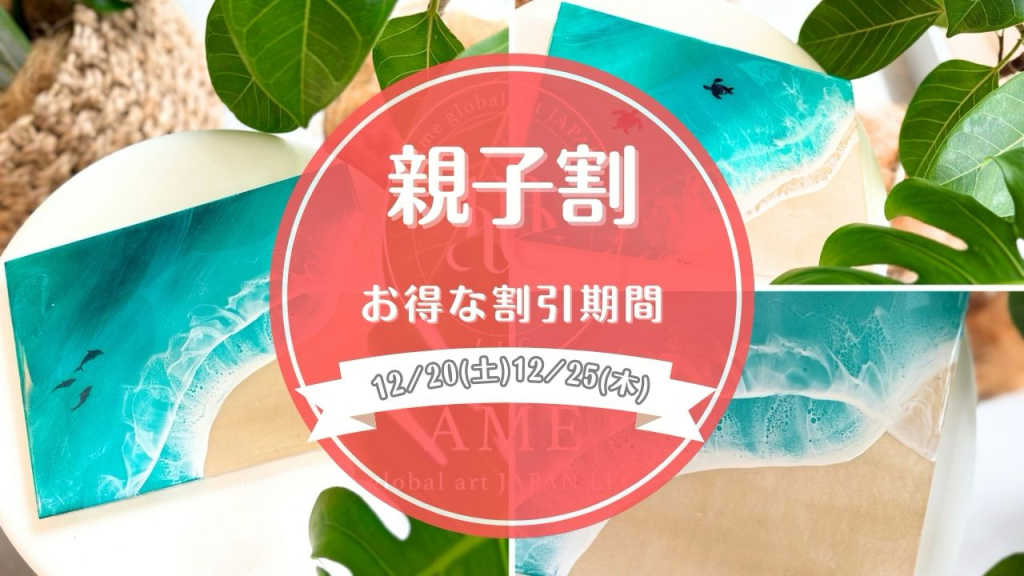 【12/20(土)~12/25(木)限定開催!!】 親子で参加すると超お得🉐🉐子供料金が半額に✨ ※対象年齢7歳~中学3年生 ⚠️⚠️こちらは【親子割プラン】です。 大人1名様の参加が必須となります。子供のみの予約はできませんのでご注意下さい。必ずオプションメニューから大人追加をご選択下さい。⚠️⚠️ ・大人7480円 ・子供 3750円 🎨波アートパネル製作体験🎨 ├A4サイズのアートパネルを製作します。 ▪所有時間/90分 \お友達追加はこちら⬇️⬇️⬇️/ ▻►https://lin.ee/p3sQg3h ※お子様は小学校1年生からご体験可能 ✼••┈┈••✼••┈┈••✼••┈┈••✼••┈┈••✼ 【ご注意事項】 - 対象年齢は7歳以上となります。カッターを使用するワークショップに関しては、カッター使用時は必ず保護者の方がご担当ください。 - ご同伴者様は0歳から可能です。 - インクが衣服に付着すると落ちにくい性質があります。汚れてもよい服装、またはエプロンのご持参をお願いいたします。 以上、ご理解とご協力をお願いいたします。
