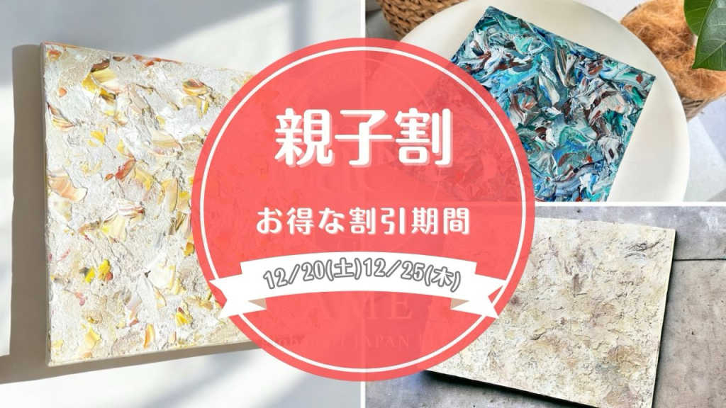 【12/20(土)~12/25(木)限定開催!!】 親子で参加すると超お得🉐🉐子供料金が半額に✨ ※対象年齢5歳~中学3年生 ⚠️⚠️こちらは【親子割プラン】です。 大人1名様の参加が必須となります。子供のみの予約はできませんのでご注意下さい。必ずオプションメニューから大人追加をご選択下さい。⚠️⚠️ ・大人6600円 ・子供 3300円 🎨テクスチャーアートパネル製作体験🎨 ├アートパネルサイズ 長方形・正方形・円形からお選び頂けます。 ▪所有時間/75分~90分 \お友達追加はこちら⬇️⬇️⬇️/ ▻►https://lin.ee/p3sQg3h ※お子様は小学校1年生からご体験可能 ✼••┈┈••✼••┈┈••✼••┈┈••✼••┈┈••✼ 【ご注意事項】 - 対象年齢は7歳以上となります。カッターを使用するワークショップに関しては、カッター使用時は必ず保護者の方がご担当ください。 - ご同伴者様は0歳から可能です。 - インクが衣服に付着すると落ちにくい性質があります。汚れてもよい服装、またはエプロンのご持参をお願いいたします。 以上、ご理解とご協力をお願いいたします。