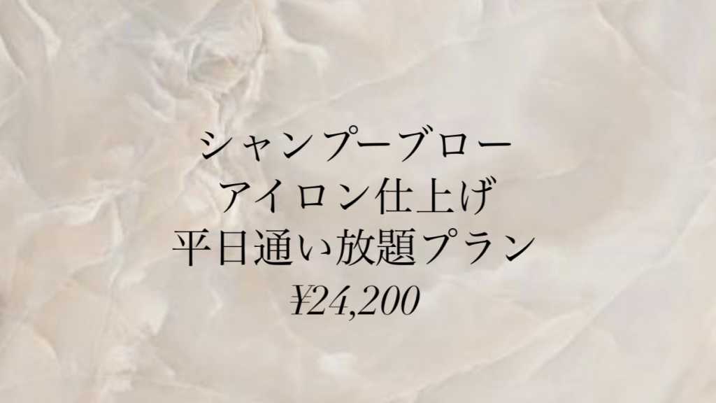 シャンプーブロー+アイロン仕上げ(ストレート、巻き髪、セット)毎日通い放題メニューです。(平日のみ) その日に合わせてストレート、ふんわり巻き髪スタイル、メンズのお客様もスタイリング剤のみ、アイロン使ってのスタイリングなど仕上げを選べるメニューです。 頭皮に優しいシャンプーを利用します。 10分以上の遅れは施術できない場合がございますのでご了承下さい。 初めてのご来店の際、定額制の決済を致します。 引き落としのお日にちは 日となります。 通い放題のメニューはカード払いのみとなっております。 2回目からのご利用の際はこちらのメニューでご予約可能です。 ¥24,200と記載されてますが、2回目以降は通い放題です。