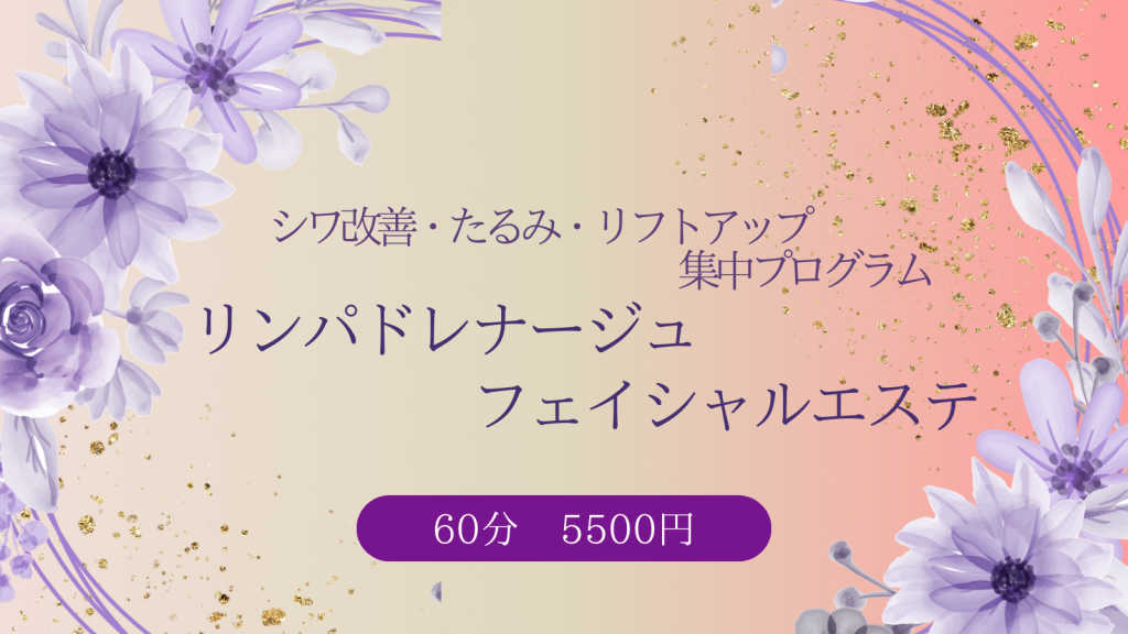 🌿【シワ改善•たるみ•リフトアップ集中プログラム】 リンパドレナージュ フェイシャルエステ 60分 〜シワ・たるみにアプローチする本格リフトアップケア〜 年齢とともに気になる「ほうれい線」「フェイスラインのもたつき」「目元のシワ」などに、最新美容機器と熟練のハンドテクニックで徹底アプローチ。 肌本来のハリ・弾力を引き出し、若々しい印象へ導きます。 ◆施術内容 * 初回のみカウンセリングあり 1. クレンジングマッサージ お肌にやさしいクレンジングでメイクや汚れをしっかりオフ 2. イオンスチーム 大容量のイオンスチームで皮ふを柔軟にし、毛穴を開かせてお手入れの効果を高めていきます 3. スチームマッサージングトリートメント イオンスチームを当てながら、優しく熟練のハンドテクニックで顔全体の筋肉にアプローチし、たるみやむくみを改善 4. スチームサクション むくみやくすみの原因となるリンパ液の流れをスムーズに導く機器で肌をクリアにしていきます 5. スチームキッシング 毛穴に詰まった悪脂肪を丁寧にじっくりと時間をかけて取り除いていきます 6. 角質、保湿ケア(拭き取り化粧水 + 保護化粧水) 不要になった角質を除去し、お肌を柔軟でなめらかにパックのなじみをよくします 7. プレミアム極上Wパック お客様の肌質に合わせたパックをセレクトします ⸻ ◆こんな方におすすめ • フェイスラインのたるみが気になる • ほうれい線・マリオネットラインが目立ってきた • 疲れて見える印象を改善したい • ノーファンデでも自信を持てる肌を目指したい ⸻ ◆料金目安(例) • 60分コース:5,500円(税込)