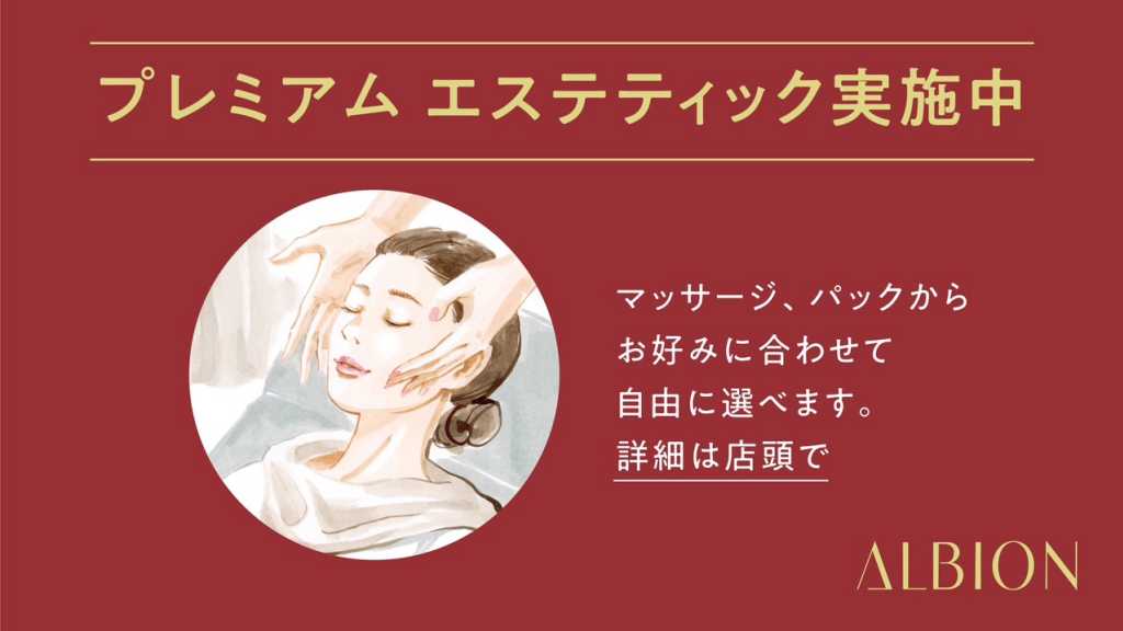 ALBIONプレミアムエステ💕 効果実感が高く、こだわり抜いたALBIONエステ専用の製品で施術いたします✨たくさんのお問い合わせをいただいているため、初回のみご予約で承ります。ぜひ、店頭でしか体験できない特別な時間を過ごしてみませんか。所要時間40分です。 ※メイク直しご希望の方は別途3,300円(税込)かかります。備考欄にメイク直し有りとご記載お願い致します。 ご自身でお直しいただける方は無料でメイク品貸し出し有。