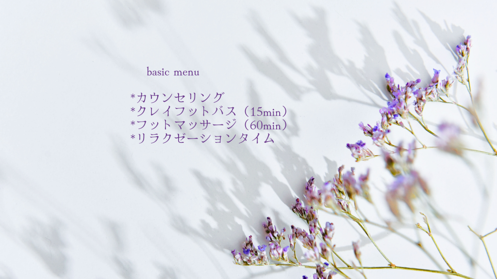 ■サービスの内容 クレイフットバスに足を入れると日々頑張っている人ほど深い relaxationを感じ、副交感神経優位になり眠気を誘います。足揉みでは痛みと気持ち良さを交互に感じながら 自律神経を整えていきます。 施術中はハーブティーを飲みながら本を読んだりお喋りの時間を楽しんで頂いたり、眠りについたりとお好きなようにリラックスして下さい。日々頑張っている身体へのご褒美とリセットの時間をお過ごし下さい。 ■当日の流れ ①足裏の状態の確認。カウンセリング。 ⇩ ②クレイフットバス 15min(5種類からお選び頂きます) ⇩ ③フットマッサージ 60min ⇩ ④リラクゼーションタイム ■予約の際の注意事項 食後30分から1時間は足揉み出来ません。 予約する場合は食後の時間帯は避けるようにして下さい。 静脈瘤や重度糖尿病の方など持病がある方は前もってお知らせ下さい。 ■キャンセルに関して ご予約のキャンセルや日時変更は、前日までにご連絡をお願いします。ご連絡は、お電話・メール・公式LINEにて承っています。また、遅れて来店された場合、ご予約のメニューよりも提供時間が短くなることや、ご予約のメニューを提供できないことがありますのでご了承ください。