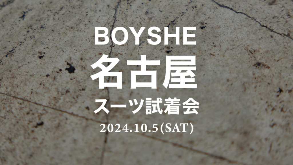 BOYSHEのオリジナルスーツ試着会を【名古屋】で開催いたします! ※試着のみ可能 ※完全予約制 ※当日キャンセルはご遠慮ください。 ※お一人様「最大15分まで」ご利用可能です。 ※時間厳守 ※同伴者は3人までとなります。 ※試着のみ可能です。 BOYSHEのオリジナルスーツがほしいけどサイズなどが不安でご購入できなかった方にお試しいただける機会でございます。 ぜひご来店ください! ⚪︎⚪︎⚪︎⚪︎⚪︎⚪︎⚪︎⚪︎⚪︎⚪︎⚪︎⚪︎⚪︎⚪︎⚪︎⚪︎⚪︎ BOYSHEオリジナルスーツ【名古屋試着会】 ⚫︎PLACE⚫︎ 〒4600003 愛知県 名古屋市中区 錦 2-13-28 龍屋ビル 5階 名古屋市営地下鉄東山線 伏見駅 徒歩1分 名古屋市営地下鉄鶴舞線 丸の内駅 徒歩4分 名古屋市営地下鉄東山線 栄駅 徒歩4分 名鉄瀬戸線 栄町駅 徒歩5分 名古屋市営地下鉄名城線 久屋大通駅 徒歩7分 名古屋市営地下鉄東山線 名古屋駅 徒歩12分 ⚫︎DATE⚫︎ 2024年10月5日 ※もしご都合が悪くなり、予約をキャンセルしたい場合、必ず下記のメールアドレスにご連絡ください。 mail@boyshe.info ※当日キャンセルはご遠慮ください。 ⚪︎⚪︎⚪︎⚪︎⚪︎⚪︎⚪︎⚪︎⚪︎⚪︎⚪︎⚪︎⚪︎⚪︎⚪︎⚪︎⚪︎ ※やむを得ず開催を中止させていただく場合がございます。ご了承下さい。 ※上記の内容は変更になる可能性がございます。ご了承下さい。