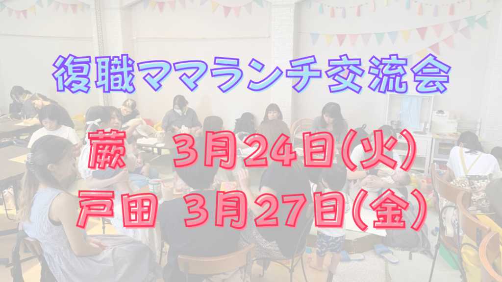 ■サービスの内容 来年度、復職されるママたちのランチ交流会です。 同じ保育園?! どんな不安がある? タイムスケジュールは? 色々とおしゃべりしましょう! 3月24日(火) 蕨ママ 3月27日(金)戸田ママ 定員:10組 参加費:1700円(ランチ+ドリンク+シフォンケーキ)のお得なプランです。(通常価格1850円前後) 子連れもちろん大歓迎! お申し込み時に、ランチをお選びください。 お子様用が必要な場合は、そちらもお知らせください。 他に伝えたいことがありましたら、備考欄にお願いします。 ■予約の際の注意事項 お一人1枠のお申し込みをお願いします。 ■キャンセルに関して キャンセルの場合は、なるべく早くお知らせください。