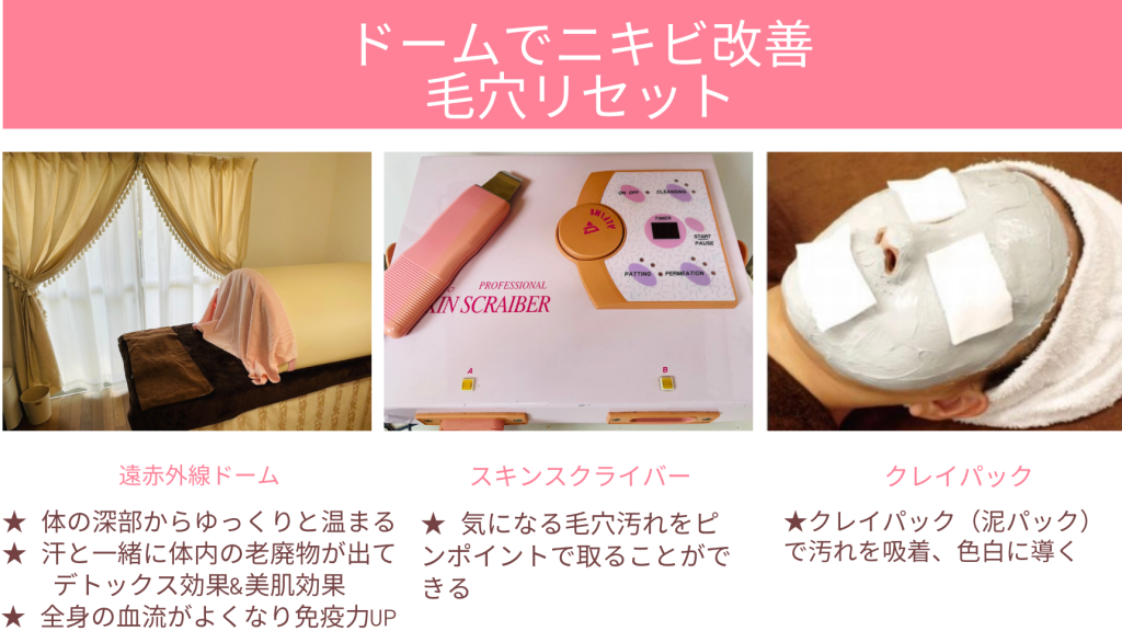 ★ドームでニキビ改善・毛穴リセット (遠赤外線ドーム+スクライバー+パック)がセットになったサロン一番のオススメメニューです。 遠赤外線ドームサウナにはこんな効果があります‼️ ★温度60度以下で寝ながら入ることができる ★体の深部からゆっくりと温まっていくため、身体への負担が少ない ★汗と一緒に体内の老廃物が出ていくため、デトックス効果&美肌効果がある ★全身の血流がよくなることで免疫力UP ★1回50分使用で300~500kclの消費 内部にはマイナスイオンが発生しているので、リラックスをより感じやすくなります🪴 スクライバーにはこんな効果があります‼️ ★ 気になる穴汚れをピンポイントで取ることができる パックではこんな効果があります‼️ ★クレイパック(泥パック)で汚れを吸着、色白に導く この3つを組み合わせることで身体のデトックス、肌のデトックスが一度にできます。 ドームで発汗すると毛穴が開く。そこにスクライバーを使って汚れを取ることで目詰まり解消ができます。 さらに、クレイパック(泥パック)で汚れを吸着、色白へと導きます。最後は化粧水、クリームでお肌を整えます。 心身共にリラックス&スッキリできるコースです✨