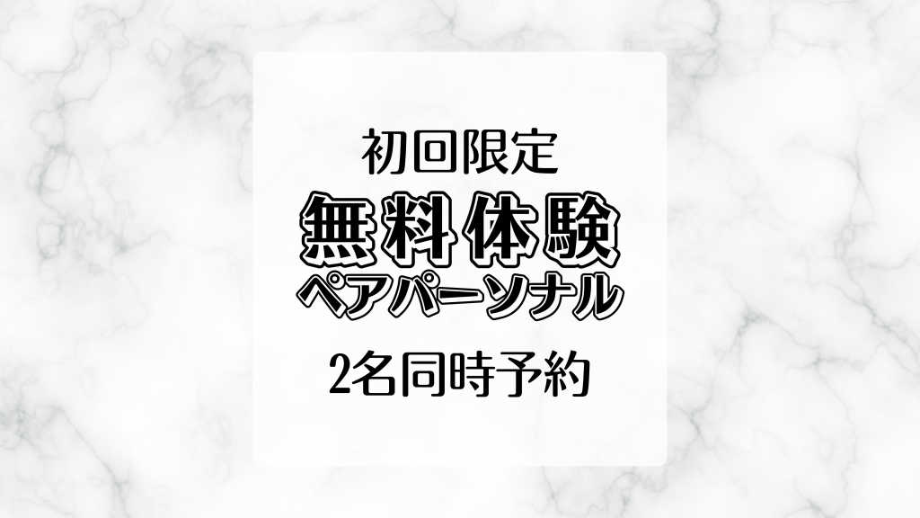 ■サービスの内容 初回限定の2名様同時ペアパーソナルトレーニング予約フォームです 2名様分をまとめてお申込みください ご予約フォームに代表者様のお名前、備考欄にお二人目のお名前をご記入ください カウンセリング込み60分となります お子様同伴をご希望の方は、子供同伴希望、()歳、()人とご予約フォームにご記入ください ■当日の流れ ご予約時間の5分前からお入りいただけます カウンセリング/施設案内・着替え/体験トレーニング /着替え/フィードバック ■予約の際の注意事項 予約は承認制となりますので、確定後にメール及びLINEでお知らせいたします 予約承認まで少々お時間をいただきますので 予約後にLINEにて「予約しました」とご連絡いただけると 確定までの時間を短縮できます ■キャンセルに関して キャンセルのご連絡はLINEよりお願いいたします キャンセル料はございません