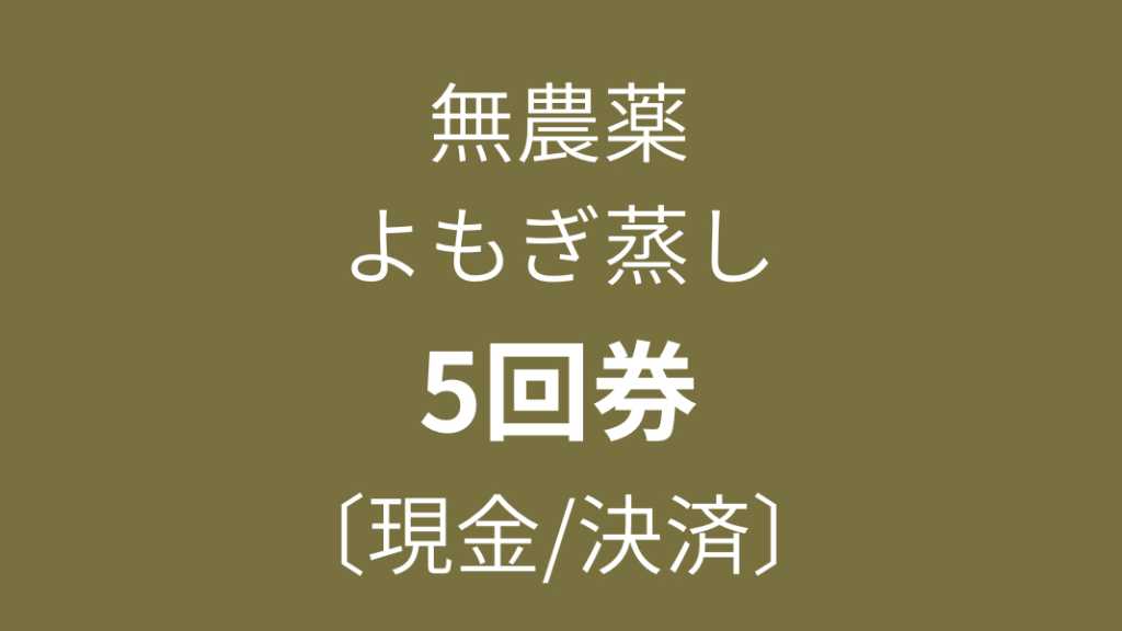 ■サービスの内容 無農薬薬草よもぎ蒸し5回の料金です。(使用期限2ヶ月) ■当日の流れ 予約時間ちょうどにお越しください。あまり早く来られますと外でお待ち頂く可能性がございます。よもぎ蒸し40分、お着替え含めて55分です。 大量に汗をかくのでファンデーションは塗らないか、店内のクレンジングシートで落とす事をお勧めします。汗で髪の毛は乱れます。ヘアセットして頂くスペースはありませんので、気になる方は帽子等お持ちください。 ■予約の際の注意事項 植物アレルギーのある方は判主治医にご相談ください。あくまでも民間療法であり、治療ではありません。疾患が完治する訳ではございません。 ご自身の判断にお任せしますので、アレルギー反応が出た場合も一切の責任を負いかねます。 ■キャンセルに関して 当日キャンセルはお支払い頂いた料金をお返しする事はできません。キャンセルの場合は必ず当日朝7時までに公式LINEに連絡をお願いします。それ以降のキャンセルはキャンセル料として一回分の料金が決済されます。返金はできません。