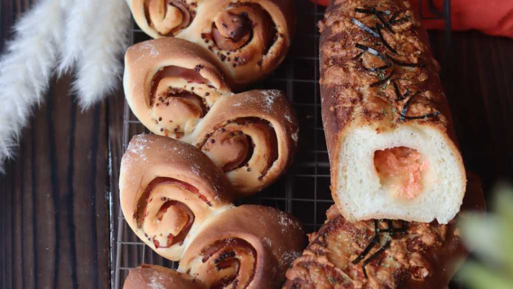 一つの生地から2つの成型を楽しめます。 ベーコンエピは粒マスタードを生地にぬり、ベーコンを巻き込んで麦の穂の形に成形します。 明太フランスは、中にも外にも明太ソースとチーズで贅沢に。 そして中にはやわらかなお餅も入れて具材とします! 魅力的な2本のパンをお持ち帰りできます。 教室では、講師作成のパンとおかず,またはスープ、コーヒーと供に軽食があります。