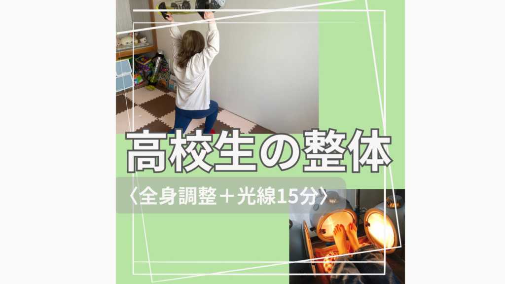 【高校生の方はこちら】 その日の状態に合わせて全身調整(骨盤調整を含む)と光線療法(15分)を合わせたプランです。 「姿勢が悪いのが気になる」「便通が悪い」というお悩みから「スポーツパフォーマンスを向上させたい」「ケガをしにくい体づくりしたい」という要望など個別に対応させていただいています。