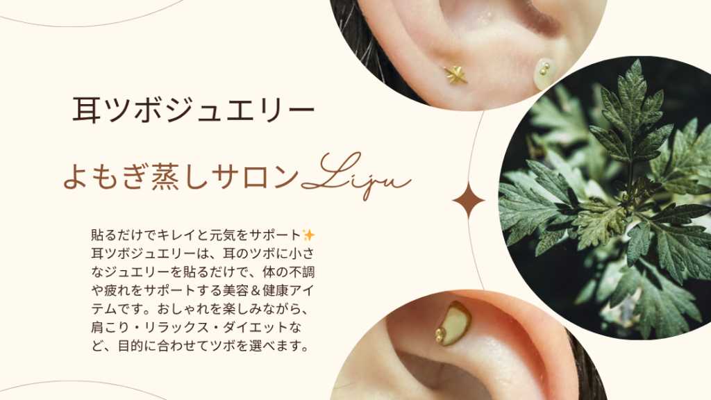 サービス内容 よもぎ蒸しで体を芯から温め血流を良くした後、耳ほぐしと耳ツボジュエリーでダイエット・肩こり・リラックスにアプローチ。 施術の流れ 1. よもぎ蒸し(40分)で身体を芯から温める 2. 耳ほぐしケア(約5分) 3. 耳ツボジュエリー貼付 1. 体験コース(両耳4〜6粒) • 施術時間:約20分(耳ほぐし5分+ジュエリー貼付15分) • 内容:耳をほぐして血流を整え、ダイエット・肩こり・リラックスなどの耳ツボを体験 注意事項 以下に該当する方は施術を控えさせていただきます。 • 発熱・炎症・感染症など、体調がすぐれない方 • 耳や皮膚にキズ・かぶれ・湿疹などがある方 • 絆創膏・テープ・重度のチタン・金属アレルギーのある方 • 妊娠中・授乳中の方 ※当店のジュエリーは、金属アレルギーが起こりにくい金粒・チタン・シールを使用しています。 ■キャンセルに関して:キャンセルの際は、ご連絡をお願いいたします。
