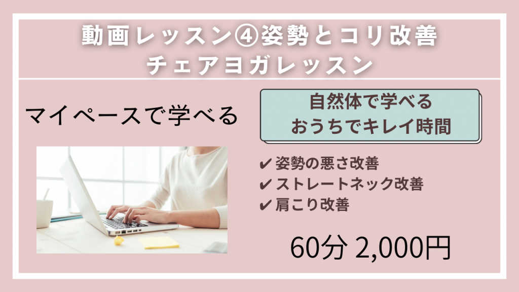 グループレッスン初級④ 姿勢とコリチェアヨガ&顔ヨガバランス改善 まず正しい座り方から習って頂き その後はセルフのほぐし方 チェアヨガポーズなどを習って頂きます。 ☑️姿勢が悪い ☑️ストレートネック ☑️鎖骨が出ていない ☑️鎖骨がVになっている ☑️お顔の左右差がある ☑️肩こりが酷い ☑️口角が下がっている ☑️マリオネットラインが深い ☑️頭皮が硬い などのお悩みがある方に オススメのレッスンです ※まずはニッコリスマイルからお受け下さい ※こちらのレッスンは動画を見て頂くレッスンになります。 ※動画の視聴はGoogleドライブをお使い下さい ご予約後はお手数ですが 公式LINEよりフルネームと ご予約のレッスン名をお知らせ下さい。 詳細をお送りさせて頂きます。