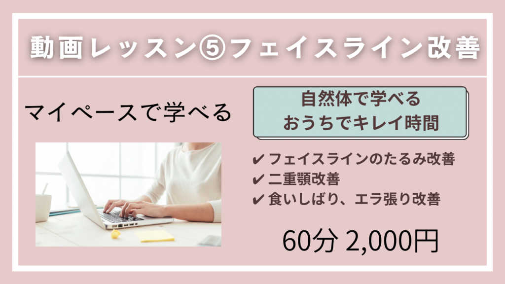 グループレッスン中級⑤ フェイスライン改善動画レッスン ☑️フェイスラインがたるんできた ☑️二重アゴが気になる ☑️エラの張りが気になる ☑️食いしばりが酷い ☑️頬のボリュームをアップしたい ☑️ほうれい線 ☑️マリオネットライン そんな方にオススメのレッスンです 約6ポーズ習って頂きます ※まずはニッコリスマイルからお受け下さい ※こちらは動画を見て頂くレッスンに なっております。 お好きな時に何度でもご覧頂けます ※動画の視聴はGoogleドライブをお使い下さい ご予約後はお手数ですが 公式LINEよりフルネームと ご予約のレッスン名をお知らせ下さい。 詳細をお送りさせて頂きます。