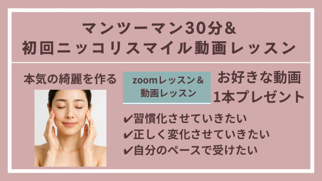 初回限定🎁初めての方向け30分マンツーマンレッスン➕ニッコリスマイル動画レッスン➕お好きな動画レッスンのセットになります。 ※日程はマンツーマンレッスン30分からお選びください フェイシャルヨガが初めての方向けの、30分のマンツーマンレッスン付きの、レッスンになります。 初めにニッコリスマイルの動画レッスンをお送りいたしますので、お時間のございます時に動画を見て頂き、マンツーマンレッスンの時に直接アドバイスさせて頂きます。 🎁その後お好きな動画レッスン1本を、プレゼントさせて頂きます。 1️⃣ニッコリスマイル動画レッスン 2️⃣マンツーマンレッスン30分 3️⃣お好きな動画レッスン ⸻ ◆ レッスンの内容 この動画レッスンでは、表情筋トレーニングの基本から丁寧にお伝えします。 初めての方でも安心してご覧いただける構成です。 ⸻ ◆ こんなことを学べます ✅ なぜ自己流トレーニングでは効果が出にくいのか? ✅ 本当に効果を出すためのトレーニング法 ✅ 表情筋の構造や働きについて ✅ まずどこから始めるのが最も効果的なのか? など ⸻ ◆ 特典 ・当日のレッスン動画(数ヶ月間視聴可能) ・さらに、見本動画、お好きな動画も別途プレゼント! → お好きな時間に繰り返し練習できます。 ⸻ ◆ ご予約方法 ご予約後は、公式LINEにて以下をお知らせください: ・お名前(フルネーム) ・ご予約されたレッスン名 → 確認後、詳細をお送りいたします。 ※ご連絡頂けない場合、自動的にキャンセルとさせて頂きます。 何卒ご了承お願いいたします。 ⸻ ◆ お支払い方法 ・銀行振込 ・PayPay ・PayPal