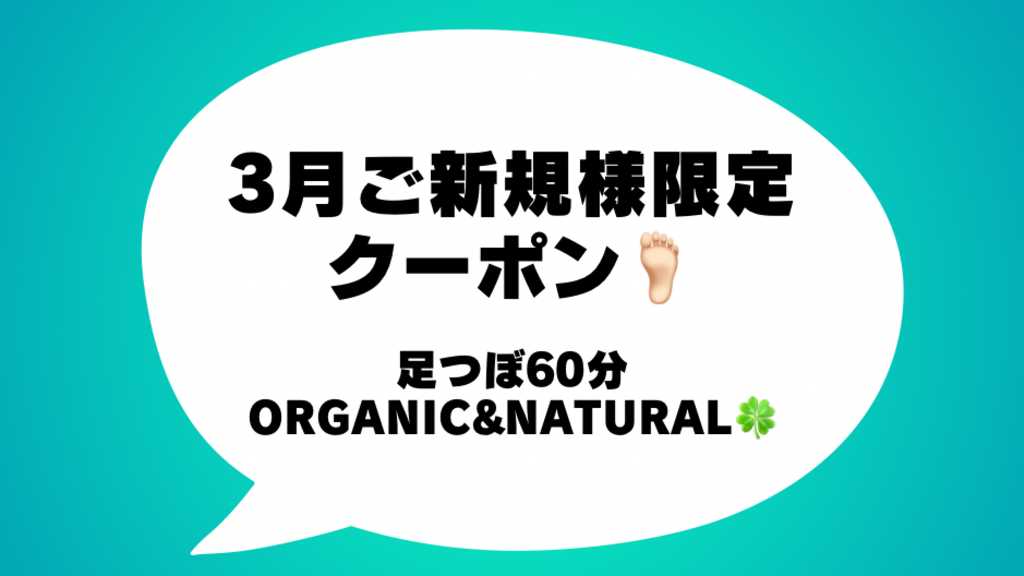 【足つぼ60分organic&natural コース👣】 3月、ご新規限定で特別価格にてご提供させて頂きます‼︎🙌🏻 通常価格¥10,000 ⬇︎⬇︎⬇︎⬇︎⬇︎ ¥9.500‼️‼️‼️ ・足裏~ふくらはぎ、全ての反射区を網羅し、しっかり流していきます👣 ・オーガニックのオイル、クリームを使用🌿 お肌に優しいのは勿論、香りによるリラックス効果も‼︎‼︎ ・心地良い圧〜激強圧まで対応しております👍🏻 ※当店、現金のみになります。 ※他クーポン等との併用は出来ません。