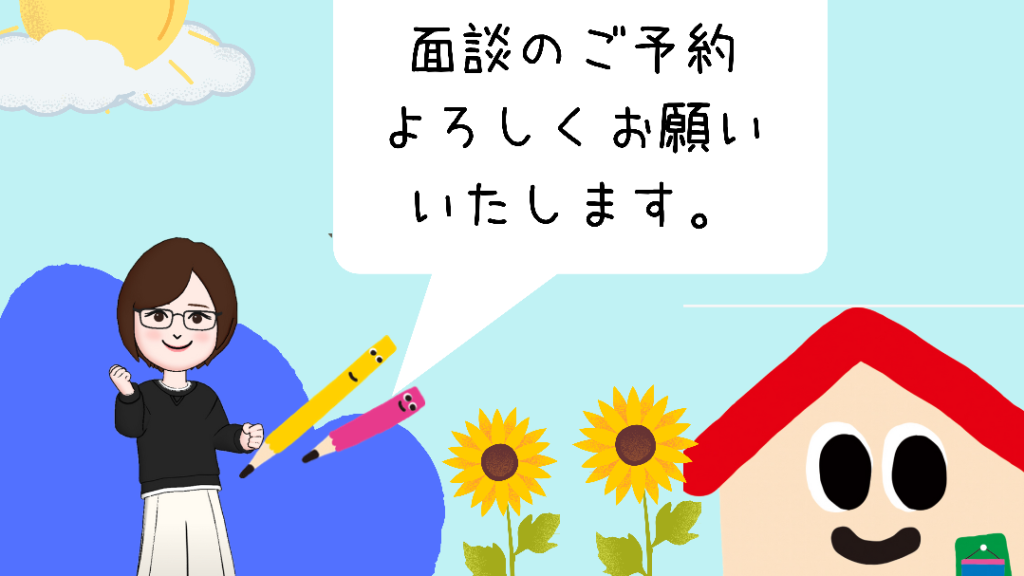 面談のご予約サービスです。 面談希望日、時間を選択し、お子さまの お名前でご予約ください。 ご兄弟でお通いの方は、 上のお子さまのお名前でご予約ください。 学習状況のご報告と夏休みの学習計画など お話させていただきます。 夏休み、パワーアップに向けて作戦会議です。お忙しいと思いますがぜひよろしくお願いいたします。 備考欄に特にお話したいこと、ご相談があればご入力ください。