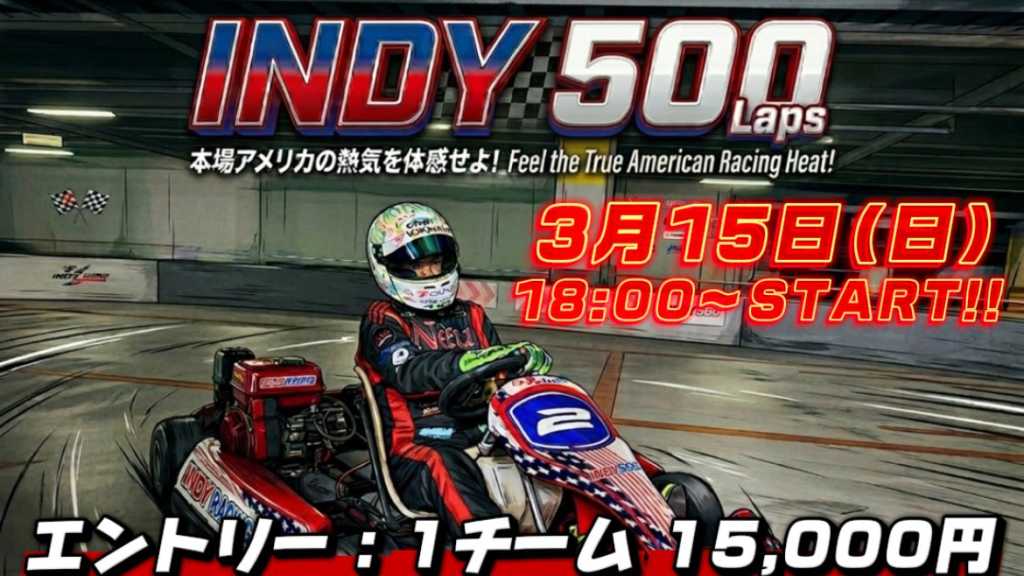 毎月恒例のチャンピオンシップがやってくる!🔥 Indy Kart 耐久レースシリーズ🏎️💨 略して【I耐】!! 最大5チームにて行われる耐久レース✨️✨ 1チームの参加費が12,000円です/ お一人の方でも店内マッチングでの参加となるので、最大でも 6,000円でエントリー可能です! 【I耐】は、インディカートならではの方式 レース前に決める順位ハンディのペナルティ?? 前回優勝者はチーム解散しシャッフル?? など、優勝を目指し熱を高めるだけでなく参加者全員でワイワイ楽しめる大会を目指します 速さだけでは勝つことが出来ないスリリングなレースをどうぞお楽しみにしてください♪ 当日の流れ 初めに12分間の練習走行があります チーム内で練習時間を決め、ドライバーチェンジ込で12分を利用ください その後、レースで使用するマシンの抽選をします ジャンケンで抽選の順番を決めます ※抽選の順番=スタート順 携帯のアプリを利用して、マシン抽選後 レーススタートいたします 予約方法 2人以上で予約の場合は、チーム代表者が行ってください その際には、備考欄に参加メンバーの名前などを記載の上受付時に確認が無いようよろしくお願い致します お一人で参加される場合は 同じお一人参加の方と店内マッチングで即席チームを形成致しますので、2人以上のチームとなります エントリーの枠は先着で5チームとなります 既に5チーム参加決定の場合は、予約可能であっても参加不可となる場合がありますので予めご了承ください 大会概要などの連絡を行いますので メールアドレスは必ずよく利用しているものにしてください こちらからは【gmail.com】から連絡を行うので 受信拒否などされないようよろしくお願い致します 参加概要 1チーム 2名以上からエントリー可能!! 1人でご予約の場合、店舗にて同じ一人参加の方と マッチングしレース参加🏎 参加費 : チーム 12,000円! 例、3人チームの場合1人4,000円で参加可能