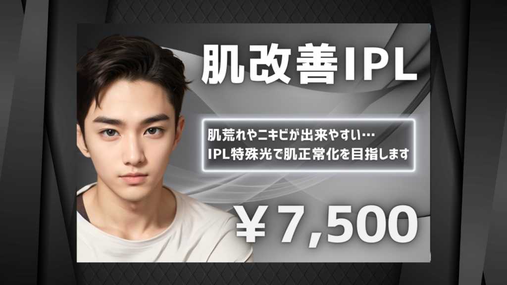 肌荒れやニキビが出来やすい… そんな肌悩みをIPL特殊光で肌正常化を目指します。 IPLとは? 複数の波長を持つ特殊な光を照射する事で、様々な肌悩みに複合的にアプローチする事ができます。 ・毛穴開きが気になる ・くすみを取り美肌になりたい ・ニキビをなくしたい ・しわ・ほうれい線が気になる ☆乾燥や紫外線により沈殿したメラニン色素により出来たシミ等を、肌活性に有効な光を照射する事で肌の基礎作りをサポート。肌深部を整えて表面もキメの整った美肌へ導きます。 【 ご案内事項 】 ※ カウンセリングの結果、お肌の状態等により当日施術が出来ない場合もございます。 ※ 無料駐車場は指定のスペースをご利用ください。 →公式LINEよりご確認頂けます。(HPでもご案内) ※ 公式LINE → https://lin.ee/DMyeN3b ※ 公式HP → https://mens-gemstone.com