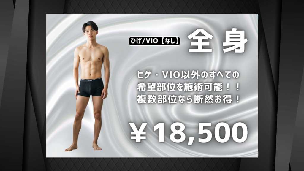 各部位を組合せるよりお得な全身脱毛プラン! 気になるムダ毛が複数個所あればこのプランがおすすめです。 【 ご案内事項 】 ※ 前日の夜までに希望脱毛部位を「電動シェーバー」で処理をしてからお越しください。 ※ カウンセリングの結果、お肌の状態等により当日施術が出来ない場合もございます。 ※ 無料駐車場は指定のスペースをご利用ください。 →公式LINEよりご確認頂けます。(HPでもご案内) ※ 公式LINE → https://lin.ee/DMyeN3b ※ 公式HP → https://mens-gemstone.com