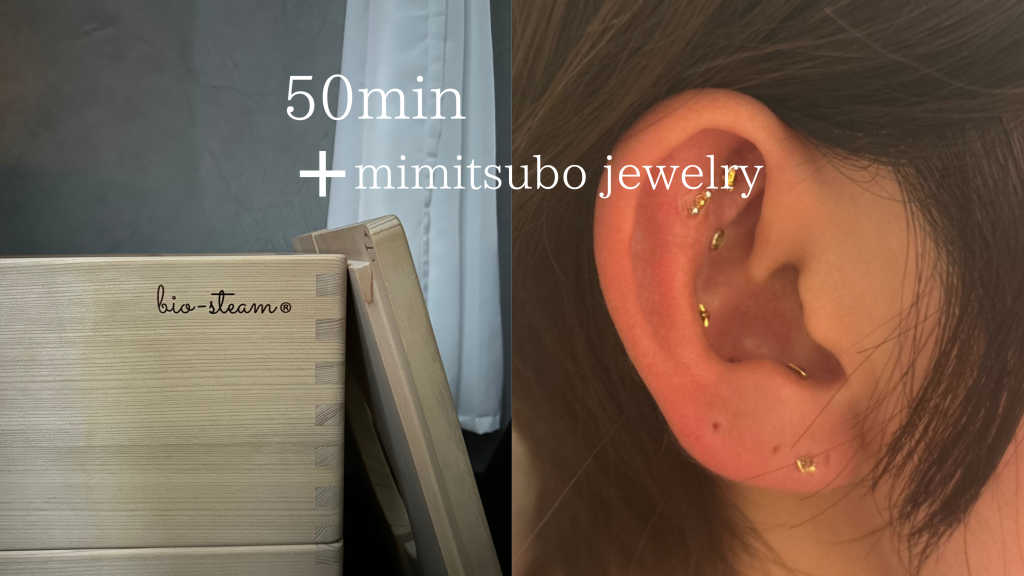 【ビオスチーム50分+耳ツボジュエリー】 ビオスチームと合わせてご予約いただくことで お得に耳つぼジュエリー施術を受けていただけます。 耳つぼジュエリーは、耳にあるツボを やさしく刺激しながら、 健康・美容のサポートを目的とした施術です。 耳には全身とつながる多くのツボが集まっており、 お悩みに合わせてツボを選び、 ジュエリーを装着していきます。 冷え・むくみ・肩こり・首こり・自律神経の乱れ リフトアップ・ダイエットサポートなどを 目的とした方におすすめです。 アクセサリー感覚で楽しめるため、 「かわいい」と「整える」を同時に叶えたい方にも 人気のメニューです。 ※医療行為ではありません。