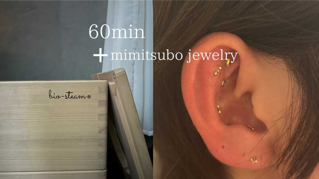 【ビオスチーム60分+耳ツボジュエリー】 ビオスチームと合わせてご予約いただくことで お得に耳つぼジュエリー施術を受けていただけます。 耳つぼジュエリーは、耳にあるツボを やさしく刺激しながら、 健康・美容のサポートを目的とした施術です。 耳には全身とつながる多くのツボが集まっており、 お悩みに合わせてツボを選び、 ジュエリーを装着していきます。 冷え・むくみ・肩こり・首こり・自律神経の乱れ リフトアップ・ダイエットサポートなどを 目的とした方におすすめです。 アクセサリー感覚で楽しめるため、 「かわいい」と「整える」を同時に叶えたい方にも 人気のメニューです。 ※医療行為ではありません。