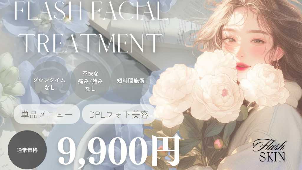 最新の精密光テクノロジーを用いた、次世代の光フェイシャル。従来のフォトでは届きにくかった薄いお悩みや、お肌の濁りの原因にピンポイントでアプローチし、内側から発光するような「水光ツヤハリ肌」へと導きます。 🤍FLASHSKINの特徴 その日の肌状態・お悩みに合わせて光を選ぶ オーダーメイド型フォトフェイシャルです✨ 肌悩みに合わせてフィルターを切り替え、 必要な光だけをやさしく届けることで、 刺激を抑えながら、肌環境を整えていきます。 ・肌悩み別に光をセレクト ・刺激を抑えたやさしいフォトケア ・ダウンタイムほぼなし ・他メニューとの組み合わせも可能 ・定期的な肌管理に◎ 【施術の流れ】(トータル約60分) 1. カウンセリング・お肌チェック 2. クレンジング 3. 撮影(モニター用・目元保護) 4. 高密度DPL照射(お顔全体1周) 5. 鎮静パック&お仕上げ 6. アフターカウンセリング 🕰 所要時間:約45〜60分 ⚠️ 施術前の注意事項 ・日焼け直後、炎症がある場合は施術を控えさせていただくことがあります ・強いピーリング、レーザー治療後は一定期間あけてください ・妊娠中、持病のある方は事前にご相談ください ・施術前後は過度な日焼けをお控えください 🌙 施術後の注意事項 ・当日は長時間の入浴、サウナ、激しい運動はお控えください ・一時的に赤みやほてりを感じる場合があります(多くは数時間以内に落ち着きます) ・施術後は保湿・UVケアをしっかり行ってください ・肌の状態により効果の感じ方には個人差があります