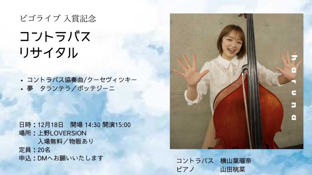 ビゴライブ 海の日グッツイベント入賞を記念してコントラバスリサイタルを開催いたします! 先着20名 無料ご招待です。 物販、チェキ会ありです✨ 2021年12月18日 会場 LOVERSION 上野 開場 14時30分 開演 15時00分 コントラバス 横山葉瑠奈 ピアノ 山田桃菜