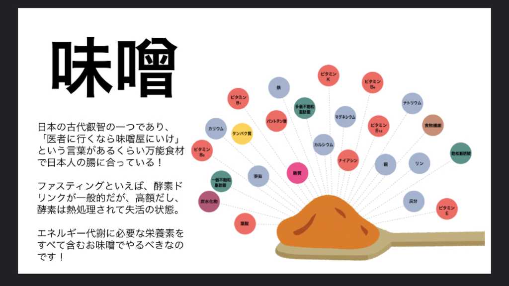 家庭に常備してある「味噌」を使ったファスティング入門コース 💡日本では昔から「医者に行くなら味噌屋に行け」という言葉があるほど、万能食材で日本人の腸に合っている味噌を活用 💡ファスティングといえば酵素ドリンクが一般的ですが、何より高額(一本1万円程度が普通、1週間のファスティングだと2本は使用するのが一般的な)だし、酵素は熱処理されて失活の状態 💡エネルギー代謝に必要な栄養素をすべて含むお味噌でファスティングを行う方法が日本人には最適なんです 「1週間コースの流れ」 1日目〜2日目→野菜味噌汁 3日目〜5日目→具なし味噌汁 6日目〜7日目→野菜味噌汁 ※野菜味噌汁とは、野菜・根菜・きのこ類・豆腐などの 【まごわやさしい】食材の中からバランスよく好きな具材を選択して下さい。 ⚠️注意 ・かつお出しOK ・肉・魚・加工食品はNG ・パック出汁OK 💡ご自身で用意していただく物 ・味噌(材料がシンプルなもの 大豆 塩 米麹) ・塩(ぬちまーす 雪塩など、マグネシウムが多い物) ・黒砂糖(原料:さとうきびお勧め) ・梅干し(原料:梅 塩 しそ シンプルな物) 家にある物を使って行いましょう! そして、ファスティング期間中は基本的に毎朝30分間、 zoomを繋いで簡単な運動&リンパマッサージ(ストレッチ)を行います。 運動をプラスすることにより、新陳代謝の効率を上げ、脂肪燃焼しやすい体質に変化させていく狙いがあります。 ファスティングと運動で頭も体も腸もリフレッシュ! ファスティングを行うことで ・頭がスッキリして、仕事の効率アップ ・食の習慣が変わり、リバウンドしにくい食生活が可能に! ・体に溜まっている脂肪が燃やすい状態になるので、トレーニングの効率がアップ ・体重も平均で2〜3キロ落ちるのでダイエットとしての効果も ※運動の時間は基本的には6:00〜6:30となりますが、お仕事などの都合で難しい場合は調整可能です。 💰お支払いについて お支払いはファスティングスタート10日前までにお振込下さい 【お振込先】 三菱UFJ銀行 長崎支店 普通 0579011 モリ ヘイタ ⚠️キャンセル料について お支払い後からファスティングスタート前日まで→50% 当日、ファスティング期間中は100% 日程変更の相談可