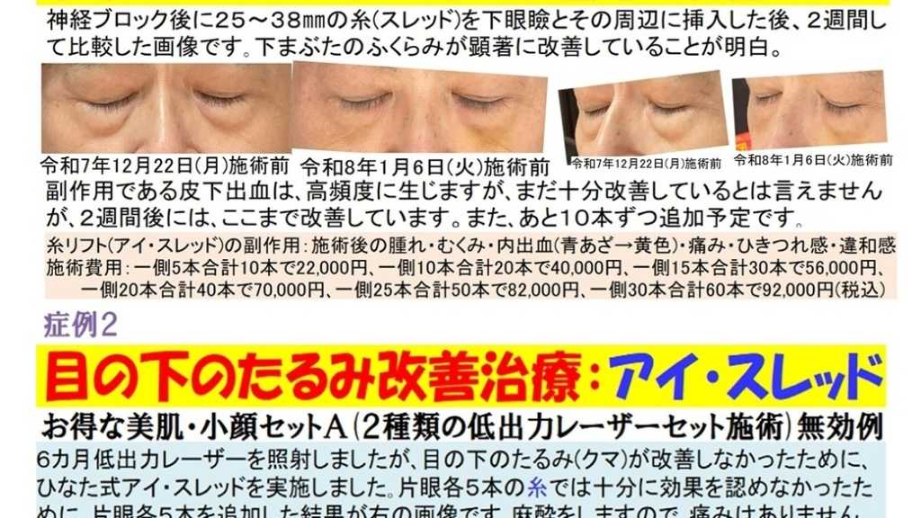 ショートスレッド(短い糸)を目の周りに挿入して、目の下のたるみ(クマ)・しわの改善や奥目を改善、さらには眼瞼下垂の治療や開眼度アップのために実施する治療法です。糸は2~3年で溶けるものを使用します。糸の周りにコラーゲンが付着するために若返ります。細胞外マトリックス(コラーゲン・ヒアルロン酸・エラスチンなど)の減少が著しい方の場合には、2~3年に1度の追加挿入をお勧め致します。 まぶたの皮膚は極めて薄いために特殊な技術を必要とします。極力浅い層に糸を挿入する必要があり、時間がかかります。一側15本両側合計30本までならば、1回の施術で完了できますが、一側20本両側合計40本以上となると2回の施術に分けさせていただく場合がございます。本来は毎回診察及び画像処理が必要ですが、その場合には、診察料及び画像診断料金は1回分しか請求いたしません。 以下税込価格です。有効例は、こちら 一側 5本両側合計10本 22,000円 一側10本両側合計20本 40,000円 一側15本両側合計30本 56,000円 一側20本両側合計40本 70,000円 一側25本両側合計50本 82,000円 一側30本両側合計60本 92,000円 ※1 診察料及び画像診断料金は、それぞれ1,100円、2,200円 合計3,300円 ※2 神経ブロックをお勧めします(税込2,200円)。 ※3 麻酔クリームをご希望の際、1,100円(税込)。 前日•当日にキャンセルをされた場合、キャンセル料2000円となります。 連絡なくキャセルされた場合や近日中に予約された場合、前日、当日にキャセルされた方は、初診患者さんでもあっても予約をその後、予約できなくなる場合がございますので、ご注意ください。