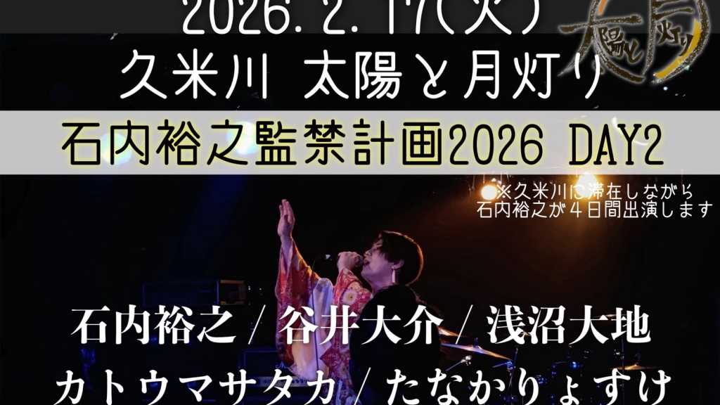 東京・久米川にあるライブスペース 太陽と月灯りにて開催されるライブイベント。 石内裕之が太陽と月灯りに4日間滞在してライブします。 ぜひ一緒に楽しい監禁計画にいたしましょう! 皆様のご来場をお待ちしております。 日時: 2026.2.17(火) 会場: 太陽と月灯り (〒189-0013 東京都東村山市栄町2丁目27-5 砂川ビル 301) 開場/開演 18:45/19:00 チケット料金: ¥3000(1ドリンク付き) 出演: 石内裕之 谷井大介 浅沼大地 カトウマサタカ たなかりょうすけ