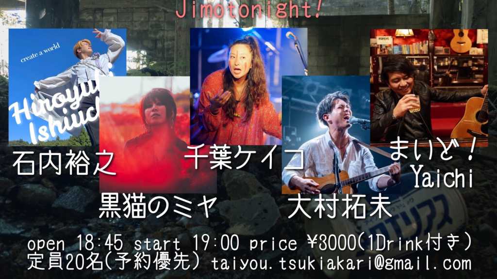 東京・久米川にあるライブスペース 太陽と月灯りにて開催されるライブイベント。 皆様のご来場をお待ちしております。 日時: 2026.3.23(月) 会場: 太陽と月灯り (〒189-0013 東京都東村山市栄町2丁目27-5 砂川ビル 301) 開場/開演 18:45/19:00 チケット料金: ¥3000(1ドリンク付き) 出演: 黒猫のミヤ 石内裕之 千葉ケイコ 大村拓未 まいど!Yaichi