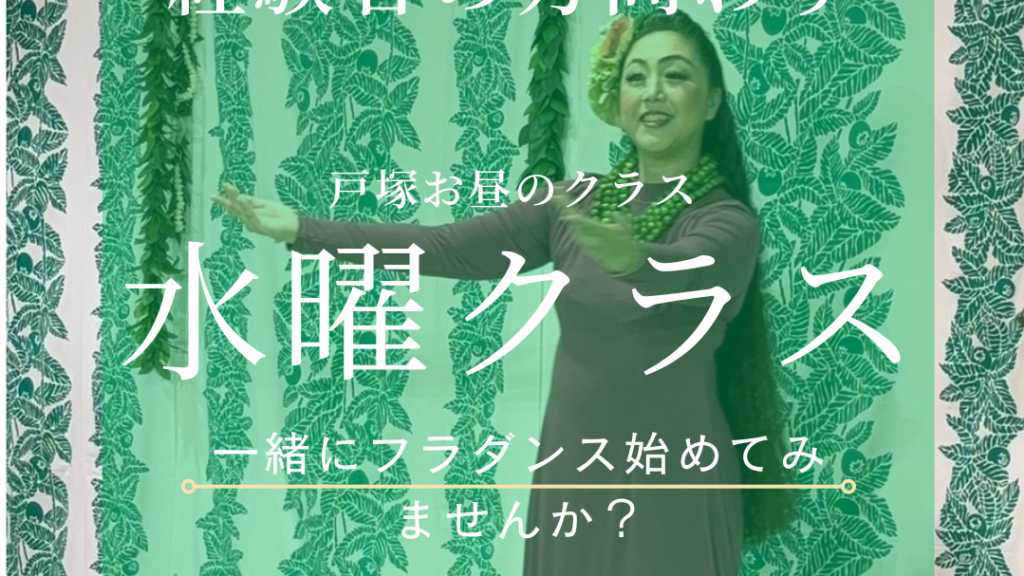 ■体験レッスンの内容 通常行われるレッスンを体験いただけます。 ■当日の流れ 受付 ⇩ お着替え ⇩ レッスン体験 ⇩ 当校の説明 ⇩ 入会受付等 ■予約の際の注意事項 Tシャツ、レギンス等の動きやすい服装でレッスンしていただきますのでご持参くださいませ。 フラのスカート(パウ)はレンタルのご用意がございます。 現在、他ハーラウに所属している場合には必ずご申告ください。入会の場合には、重複してのご入会はお断りさせていただきます。 キャンセルの場合は事前にご連絡くださいませ。 特典✨当日の入会で体験費用を入会金が割引いたします! ■キャンセルに関して 1時間前までにお願いいたします。