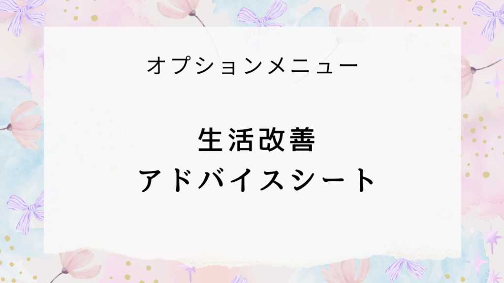 ◯オプションメニュー こちらのサービスは、ボディトリートメントorフェイシャルトリートメントにカスタムをしてご利用いだだけます。 ※ご希望のお客様は、ボディトリートメントorフェイシャルトリートメントと合わせてご予約をお願いします。 ❖初回時のタイプチェックなどのカウンセリングに基づき、お客様のためだけの[生活][食事][運動]のホルモンに係る生活改善アドバイスシートを作成します。 ※お渡しは、次回来店時となります。