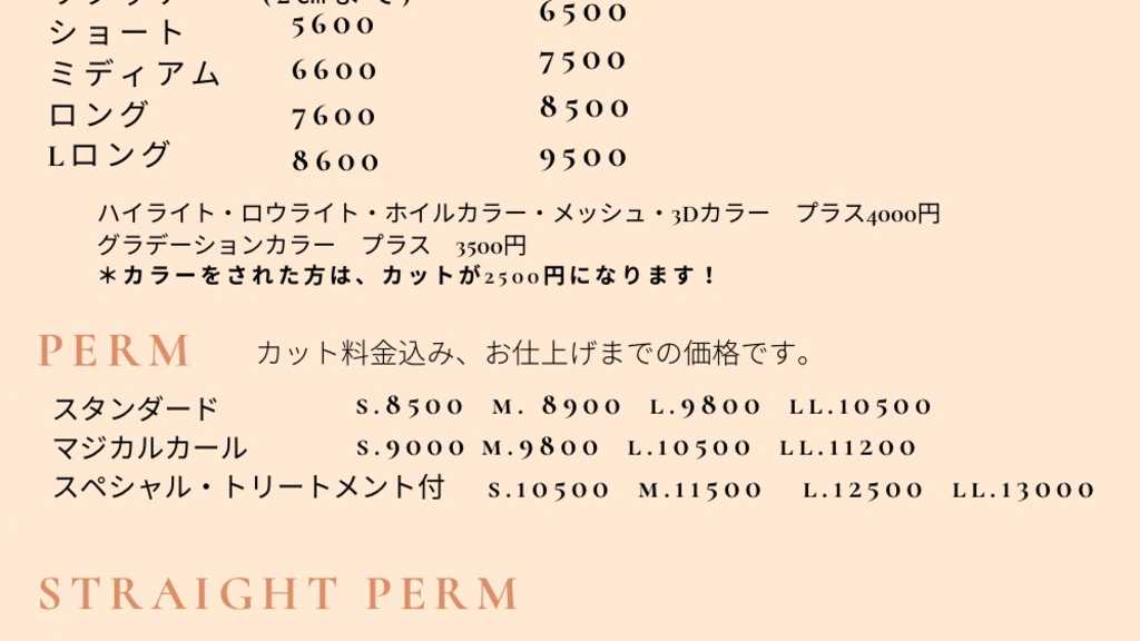 長さにより、料金が異なります。 ショート 10500 ミディアム 11500 ロング 12500 Lロング 13000