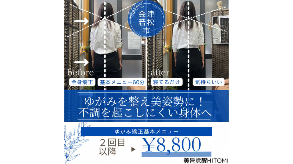 ■サービスの内容 ◎老け見え姿勢を矯正! 土台である足から頭まで全身を矯正していきます。 お時間は60分程度です。 ○お値段8,800円(税込) ※1ヶ月以内の次回ご予約で550円引き(8,250円) ※さらに1ヶ月以内のご利用で550円引き(下限7,700円) ※ジュニア17まで&シニア60からの方はさらに1,100円引き (下限6,600円) ※駐車場代1時間分の200円補助付き🎁 ※月1ご来店割引は精算時に適用いたします ○サービス説明 日常生活でなんとなく不調を抱える方・体のゆがみが気になる方! 足を整え、重心のバランス、骨盤・骨格を矯正し、 全身の歪み、猫背、巻き肩、反り腰、ポッコリお腹、 バストアップ、ヒップアップに有効なボキバキしない優しい圧の施術です! 産後、PMS、生理痛、尿漏れ、更年期による問題など、 女性特有の症状にアプローチ! 妊活中の方にもとってもおすすめな施術テクニックです! 骨格美人!姿勢美人!お洋服が綺麗に着れる! 巡りのいい体になる!なんとなく不調が快調に! ※男性にも有効な全身矯正術です! (当店ご利用中のご紹介者様のみ。例:旦那様、兄弟様) ※男性の方はプラス1,100円の加算があります。 ⚠️ご注意⚠️ ※妊娠中の方は担当医にご相談頂き、医師の整体施術許可のある方のみご提供させて頂いております。 ※人工関節など入っている所への施術はできません。 ※医療・治療ではございません。