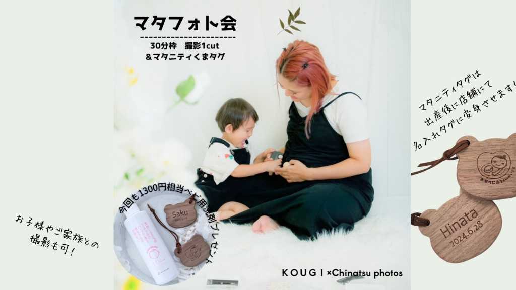 🈳あり!プレママ♡マタママ♡応援企画 カメラマンChinatsuさん によるマタニティフォト撮影会付♪ 産後店舗持参するとマタニティマークがネームタグになるくまさんタグをプレゼント♪ 3月もプレゼント特典付♪ エコー写真や母子手帳などご持参いただき撮影して下さいね♡ ご予約や詳細については下記リンクよりお願いします。 【フォトグラファーChinatsu予約サイト】 https://tol-app.jp/s/chinatsu/euofbk ■内容 個別フォト撮影です ■フォト撮影1カットLINEデータ、くまさんタグプレゼント付 ■次回 3/11(水)AM10:00~11:00 ■所要時間:各30分程度 →途中で体調が悪くなられましたらお気軽にお申しつけ下さい →楽な姿勢でご参加下さい ■参加費:¥2000 ■KOUGI内Chinatsuさんフォトルームにて 座卓ではなく、イスもご用意しますので座りやすい体勢でおかけ下さい 個室撮影ですのでお好きなポーズで撮影可 ■お子様連れやご家族同伴のご参加も可