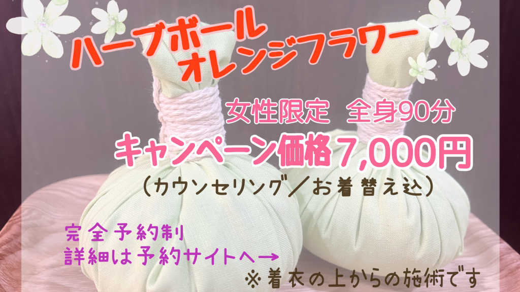 🍊オレンジフラワーのハーブボール🍊〈女性限定〉 全身90分 7,000円 (カウンセリング/お着替え込) おかげさまで開店7周年✨誠にありがとうございます! 心より感謝を込めてキャンペーンを開催中です 普段は漢方系ハーブを使っていますが、 7周年祭キャンペーンでは少し趣向を変えて お花のハーブを使っています! 今回第三弾はオレンジフラワー🍊 ふわっと甘く心身をゆるめてくれるオレンジフラワーの香りでリラックスに繋げていきます! オレンジフラワー🍊は心身をリラックスに導きます!不安や緊張をやわらげ温めるのでストレス性の頭痛や胃痛、不眠にも◯ 妊活中の方にもおすすめですよー♪ ハーブボールはオレンジフラワーの他にペパーミント、アップルピーズや生姜、穀類など肌や身体にいいものが包まれていて、お花以外にもほっこりした優しい香りがします^ ^ ペパーミントでさわやかさと温めを両立!夏のイメージ強めのペパーミントですが、いろんな効能があり使い方で通年楽しめます。あたためながらむくみをとっていきましょう ※ 妊娠中の方はハーブボールは5ヶ月以上であればお受けできます お花のハーブボールぜひ体感してみてくださいね❣️ ※ハーブボールは月経中、出血量の多い日はお控えください ■当日の流れ お着替え(〜Lサイズ相当)をご用意しております ご持参のルームウェアなどを着ていただいても大丈夫です カウンセリングシートにご記入いただき、拝見しながら体調や体質、ご希望などをうかがいます^ ^ カウンセリング→お着替え→施術→お着替え、ミネラルウォーターのご提供 施術をして感じたことなどをお話ししつつお会計となります ■予約の際の注意事項 施術の拠点が数カ所のため、完全予約(承認制)です 前日までの受付です、当日予約受付ではありません ご希望の日程より余裕をもってのご予約をお願い致します お会計は現金、クレジットをご利用いただけます こちらのメニューは ※月経中、出血量の多い日はお控えください
