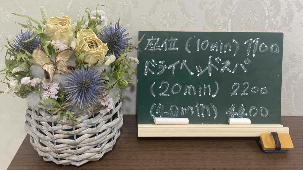 座位にて、ドライヘッドスパを施術させていただきます。ヘッドスパが初めての方におすすめです。このコースは、座ったままで頭皮のマッサージをさせていただきます。疲れた頭や肩などをスッキリさせたい方や、短時間でリフレッシュしたい方に最適なコースです。ぜひお試しください。