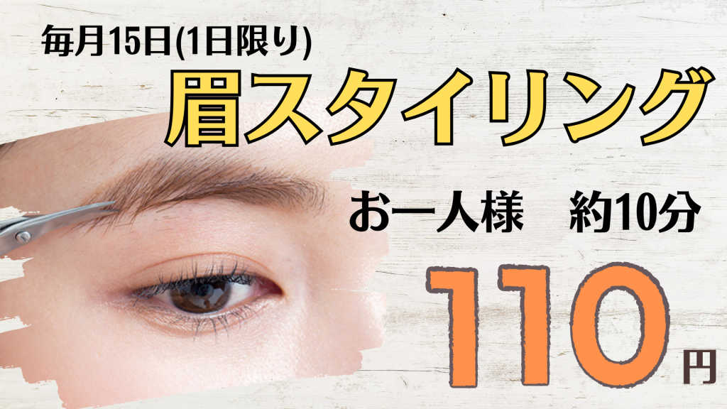 毎月15日(1日限り) 通常550円(税込)のところ→110円(税込)で眉スタイリングをさせていただきます! ・うまく眉が描けない… ・今の眉は自分にあってる?…など 眉に関心やお悩みがある方、ぜひお得な時にご利用くださいませ☆
