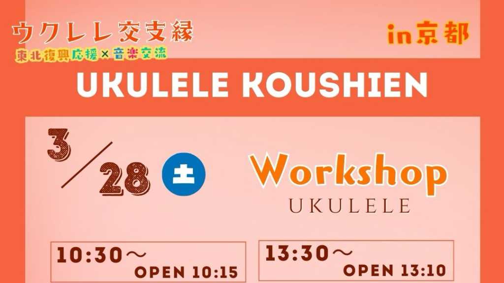 KYASさん、フラリーパッドさんに ご一緒いただき 京都 集酉楽サカタニさんにて ウクレレ交支縁を開催。 ワークショップの予約案内です。 交流プログラム参加の方は、 交流プログラム 予約サイトより オプションでの申し込みをお願い致します ワークショップのご希望の時間を選択し お申し込みください。 両方ともご参加の方は、お手数ですが それぞれにお申し込みください。 ①10:30〜12:00 ウクレレアンサンブル「やさしさに包まれたなら」 講師:fulare_pad ②13:30〜14:30 ウクレレソロ「OKULELE」New Album収録曲 講師:KYAS ワークショップのみ参加の方の参加費は 各3,500円となります。 ※交流プログラムにご参加の方の参加費は各講座 3,000円 交流プログラム予約サイト(オプション)からお申し込み下さい。 https://tol-app.jp/s/lelesapo/245r6w ※持ち物:ウクレレ、譜面台、筆記具 KYAS 公式サイト https://kyasryo.amebaownd.com/ フラリーパッド 公式サイト:https://www.fularepad.com/ 参加費 3,500円(税込) 複数での参加の際は備考欄に ご参加者のお名前を、ご記入ください。
